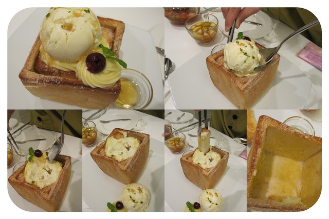 最後吐司邊在切ㄧ切沾卡達醬跟冰淇淋,我這個不愛吃吐司邊的人,竟然覺得他們特製調理的吐司邊超好吃的拉^^,外殼是吐司邊+特製砂糖,裡面的土司則是切成九宮格