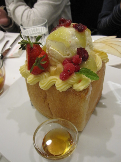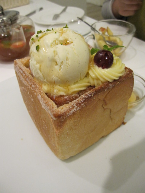 上面淋上卡達醬還有一球冰淇淋,吐司沾著卡達醬以及冰淇淋吃超好吃的