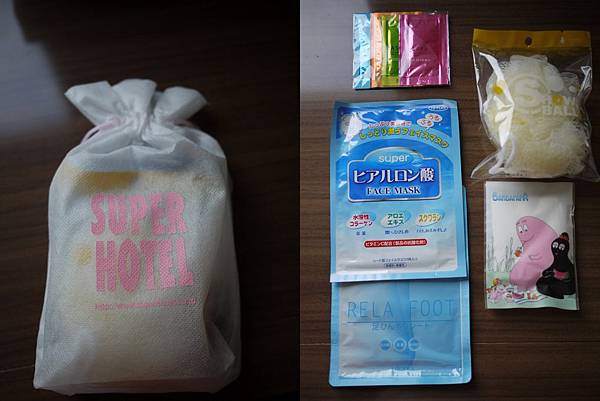 裡面有一份洗臉 卸妝 化妝水 乳液 一片面膜 還有一面類似休足時間的貼布 跟派大星的化妝棉 沐浴球